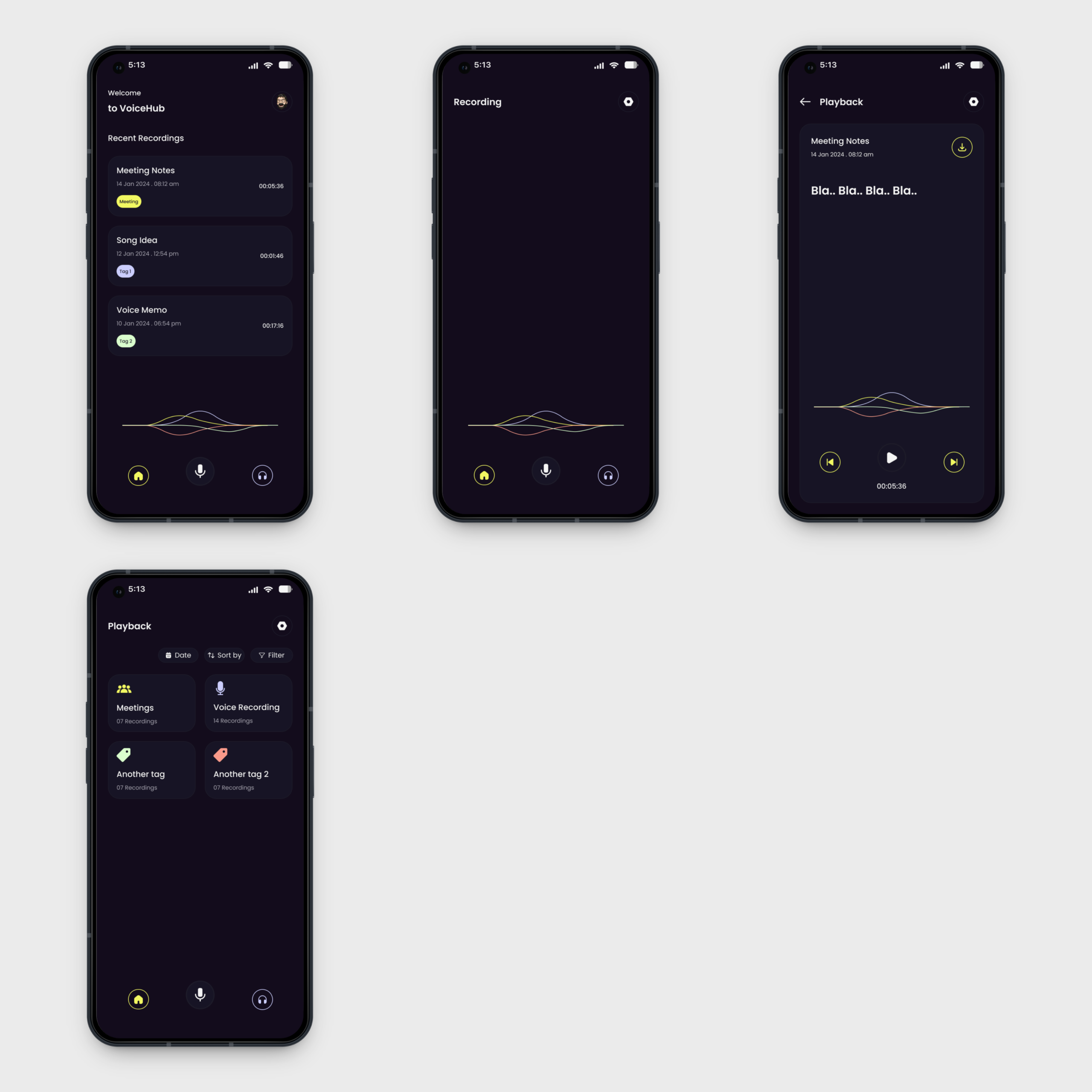 A clean, minimal design with tap-to-record functionality and simple playback controls. Built for clarity and speed, making voice recording effortless for everyday use.